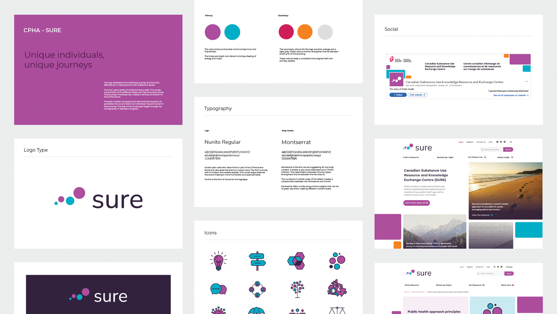 We created a logo which captures the individual journeys of those who affected or those helping and supporting others with substance use. The logotype consists of four circles grouped in a path. The circles represent the steps/progression one may encounter on their journey. The alignment of the circles creates upwards and downwards fluctuations to represent the ups and downs that are experienced along the journey. The size of the circles become larger throughout the grouping, this really helps convey that no matter the ups and downs along the journey the journey leads to progress.